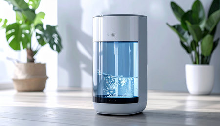In a sunlit, minimalist room, an advanced water purifier quietly works, its blue light glowing softly. This smart home device represents a commitment to health and wellness, seamlessly blending futuristic technology with the natural, serene ambiance of a modern home.