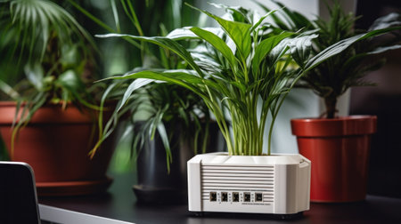 sleek white air purifier near a potted plant, created with generative ai