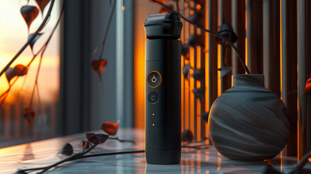 Black Electric Razor on Table With Sunset View