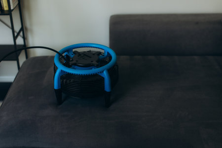 Air mover fan accelerating the drying process of a recently cleaned upholstered sofa, performing deep dry cleaning