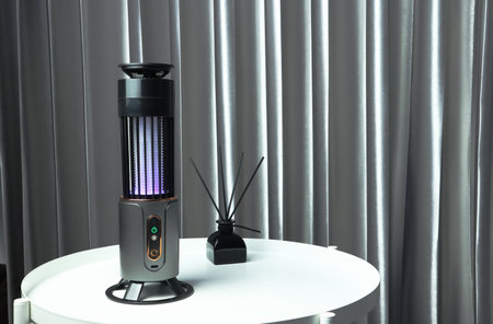 an insects mosquito electric blue light killer lamp is put on nice metal table in nice bedroom with background of grey curtain and towel and nice lamp to protect the mosquito durin