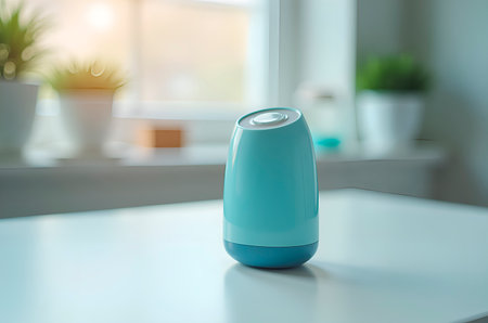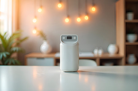 A close-up of a smart air purifier on a wooden table, glowing with an active filter symbol. Clean background for copy space.