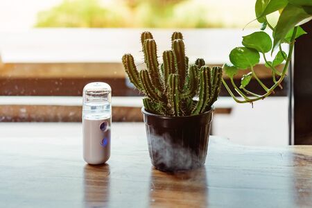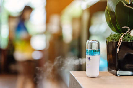 Alcohol nano mist sprayer for hand cleaning to prevent the spread of the corona virus (Covid-19) placed on the table to serve customers before buying in the coffee shop. Modern health technology.