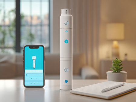 A close-up look at a white inhaler next to a glass of clear water, with soft lighting illuminating a cozy bedroom atmosphere, evoking calm and care.