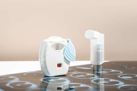 Some asthma inhalers and CT scan of the lungs on white table. Aerosol for inhalation for treat lung inflammation and prevent asthma attack.