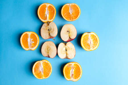 Oranges and apples on blue background