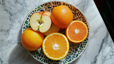 A visually appealing arrangement of fresh oranges and apple slices on a decorative plate, set against a marble background and bathed in natural light.