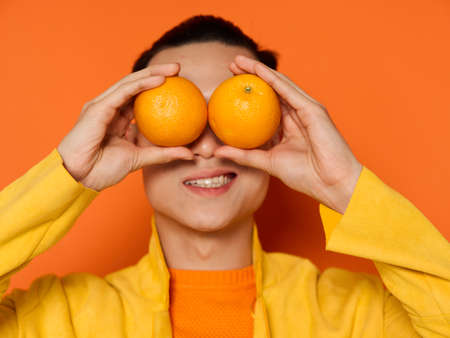 Handsome man with ripe oranges in front of his eyes charming smile