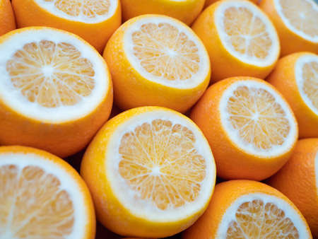 Macro food background of fresh translucent juicy sliced oranges for high resolution banners
