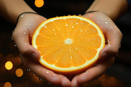 Cut part of orange fruit in human hands, generative AI