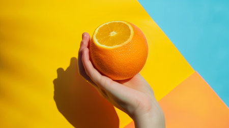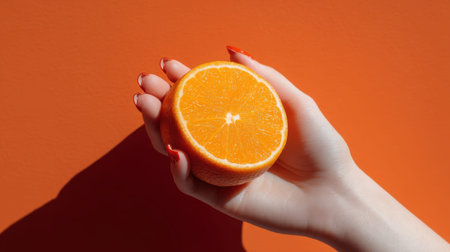 Female hand holding half orange against vibrant orange background.