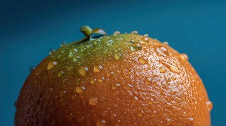 This close-up image showcases a vibrant orange covered in water droplets, highlighting its freshness and juicy texture against a blue backdrop.