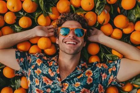 Colorful image of cheerful man surrounded by fresh oranges, dressed in summer attire, radiating joy, vacation vibes, and humor.