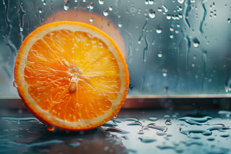 A slice of orange is sitting on a wooden cutting board. The orange is dripping with juice, and the water droplets are creating a shiny, reflective surface. Concept of freshness and vitality