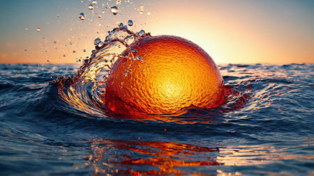 Minimalist water splash against blood orange sun sinking into indigo sea bold aphic vibrant contrast