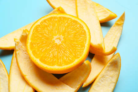 Fresh orange with peel on color background