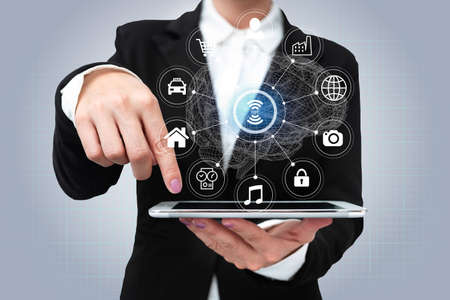 Creative IOT concept with finger clicks on a digital tablet on background. Multiexposure