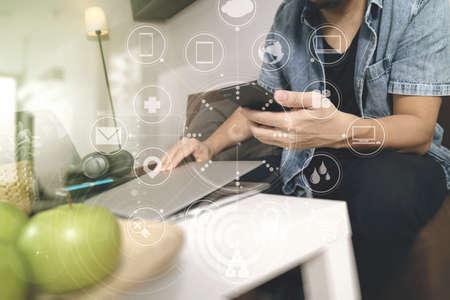 designer man hand using laptop compter and mobile payments online shopping,omni channel,sitting on sofa in living room,green apples in wooden tray,graphic interfce icons virtual screen