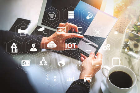 hands at work with financial reports and a laptop with other objects around, coffee, top view,business man hand working and internet of things (IoT) word diagram as concept