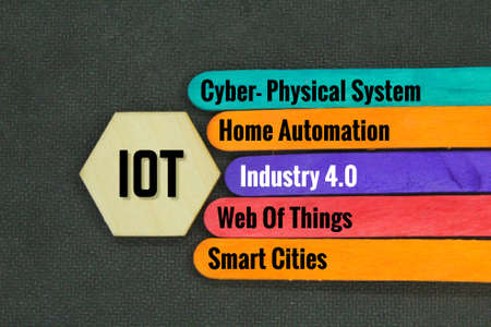 White letters Representing the acronym of the Internet of Things concept on wooden background