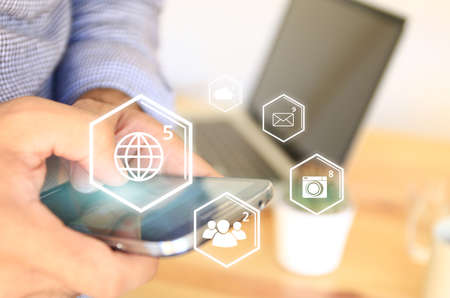 Man using mobile smartphone online shopping, Online payment. E-commerce, with internet web icons, internet of things IOT, omnichannel or multichannel marketing concept.