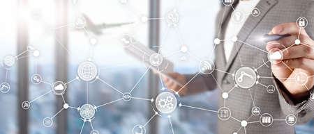 Technology industrial business process workflow organisation structure on virtual screen. IOT smart industry concept mixed media diagram