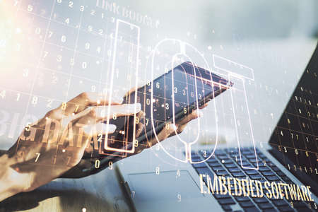 Creative IOT concept with hands typing on laptop on background. Multiexposure