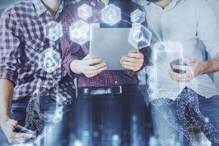 Double exposure of tech theme hologram and man and woman working together holding and using a mobile device.