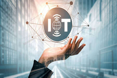 IoT Internet of Things Connecting Devices and Enabling Smart Solutions, projection on a virtual screen, Business and Technology Concept.