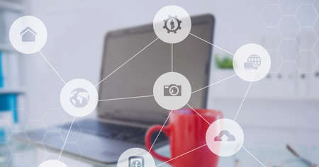 Composition of network of connections with icons over laptop. global internet of things connections, business, networking and digital interface concept digitally generated image.