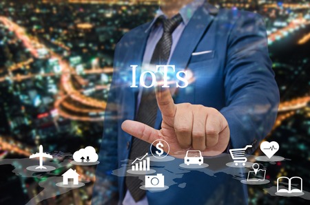 IOT business man hand working and internet of things (IoT) word diagram as concept