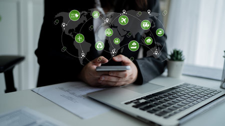 Business people use Technology E-commerce Internet Global Marketing Purchasing Plan and Bank Concept