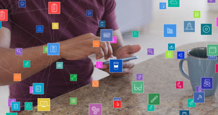 Image of network of connections with icons over biracial man cleaning smartphone. Global technology, social media and digital interface concept digitally generated image.
