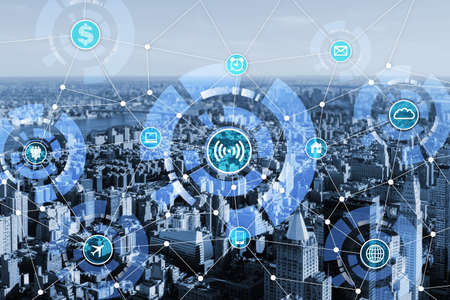Smart city and internet concept 2020. Technology and communication on modern blurred City.