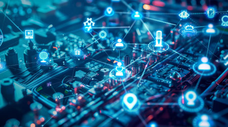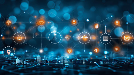 A captivating blue digital network showing connections and data transfer, featuring icons that represent various applications, ideal for technology and innovation themes.