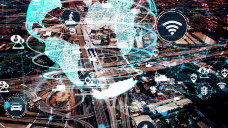 Smart transport technology concept for future car traffic on road . Virtual intelligent system makes digital information analysis to connect data of vehicle on city street . Futuristic innovation .