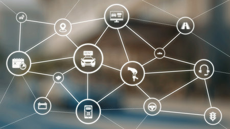 Online car rental service with booking, GPS, key handover and vehicle sharing icons representing modern mobility, travel convenience and digital rental platforms. Gist