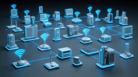 An illustration depicting a network of interconnected devices, including routers, modems, and smart home gadgets. Abstract lines represent data flow.