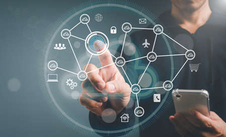 internet iot man use smartphone internet of things technology (IoT) word diagram as concept