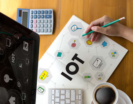 hands at work with financial reports and a laptop with other objects around, coffee, top view,business man hand working and internet of things (IoT) word diagram as concept