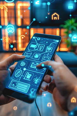 Hands programming or setting up smart home automation. Smart control panel display.