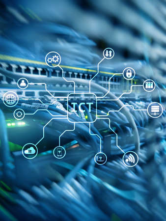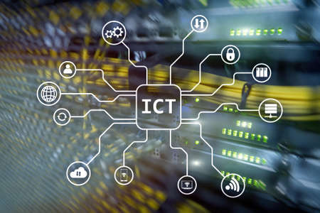 ICT - information and communications technology concept on server room background.