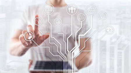 ERP Enterprise Resource Planning system on virtual screen with connections between business intelligence.