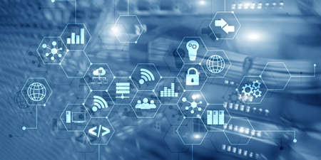 Server Room ICT information communication technology wireless internet connection big data processing center. IOT internet of things.