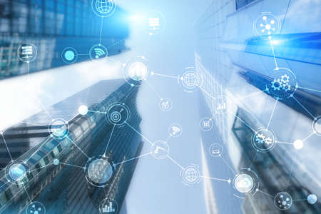 Smart City and Wireless Communication Network. Business District with office building. IOT modern technology concept.
