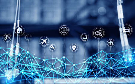 Technology industrial business process workflow organisation structure on virtual screen. IOT smart industry concept mixed media diagram