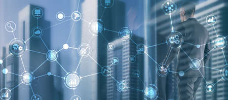 Smart City IOT Concept. Wallpaper for your site. Panoramic Business Banner
