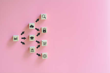 Internet of things (IoT) concept. Wooden block and arrows with the icon of communication technology, online learning, digital marketing, big data, financial, and banking on pink background.