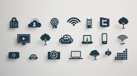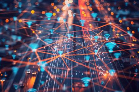 Hovering digital interface icons showing network links over foggy urban skyline, with glowing nodes. Urban, connectivity, technology, modern, high-rise, futuristic, abstract