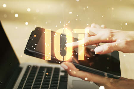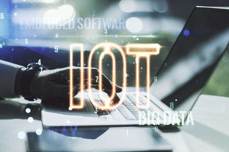 Creative IOT concept with hands typing on laptop on background. Multiexposure